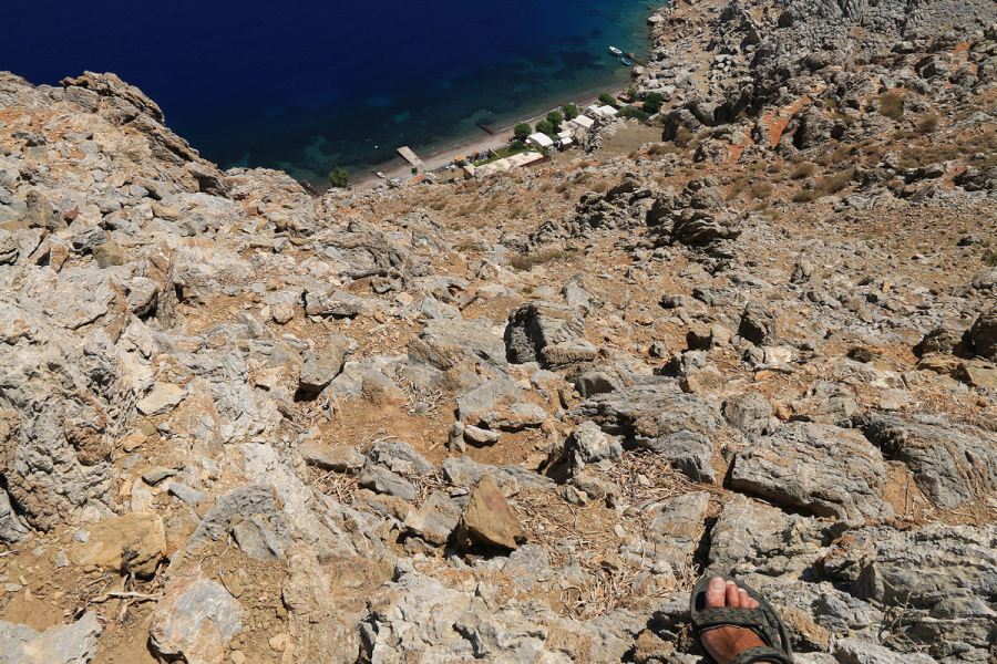 Photographer on the edge of the platform looking down about 500 feet to the small ‘locals’ beach.