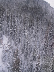 The landscape is very dramatic with vast pine forests coated in snow which stays on the trees because the air is too cold to allow any melting and above the tree-line towering rocky peaks etched with snow. There has not been much blue sky yet so the light is a little flat for photography. However, I managed to take a few photos with the Canon S95 but it will be a while before I venture out with the SLR.