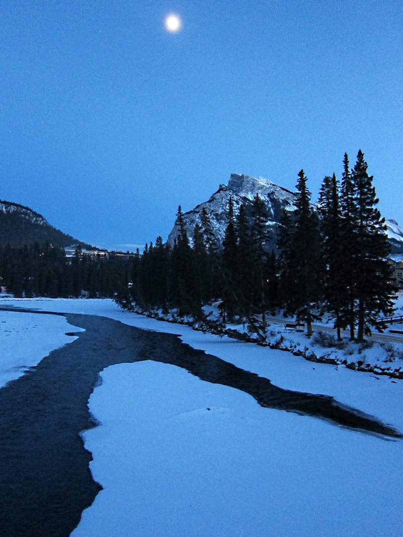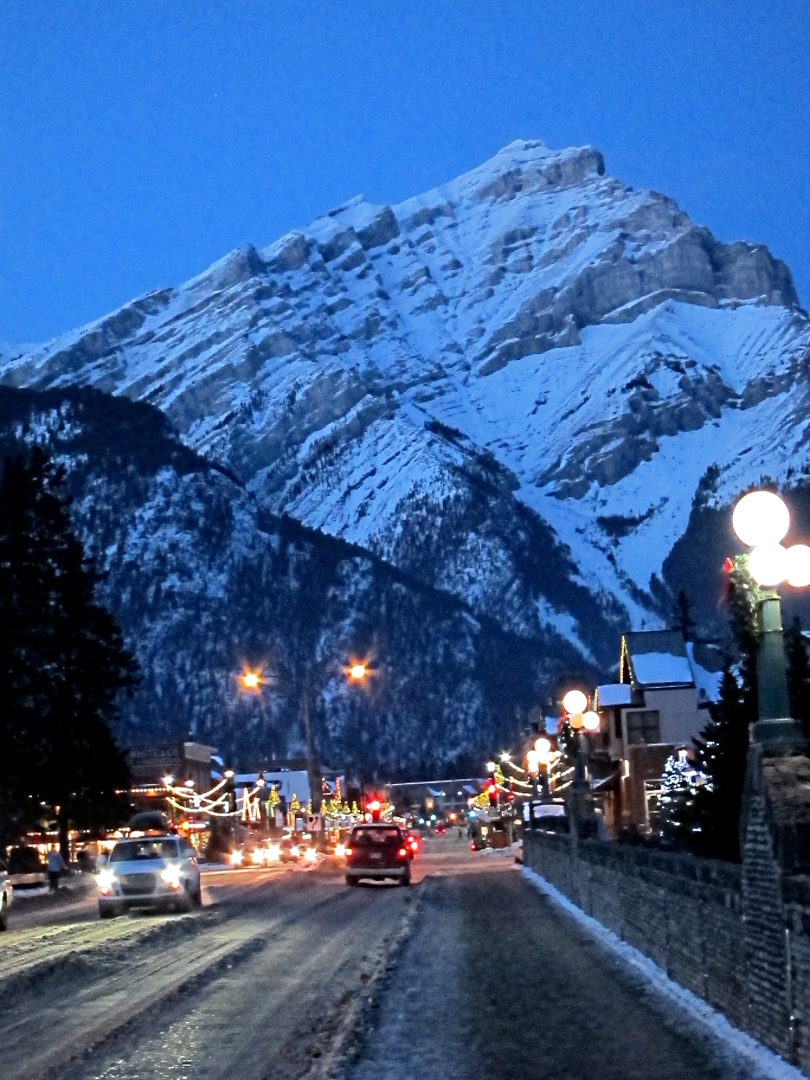 The sun was shining with almost cloudless sky and temperatures below -10oC. Ambling along the main street of Banff was dramatic with its snow covered Rocky Mountain backdrop. A couple of groups of young school children were being walked along by teachers, one group with each child holding onto a rope with knots at regular intervals to space them out tidily. They crossed the main road by the simple expedient of the lead –teacher holding up her hand and then walking across the road, all traffic simply stopping.