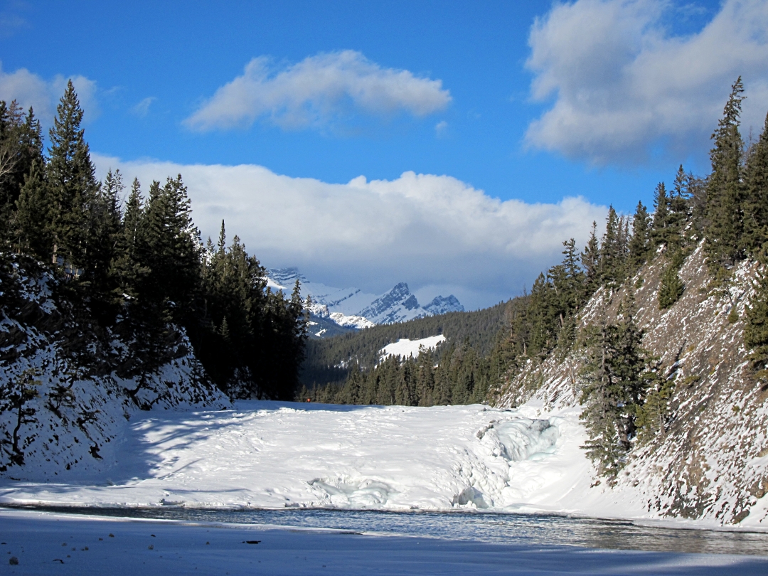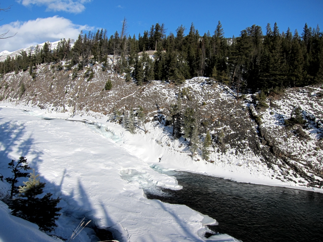 The sun was shining again as it had been on the last day-off so I went out earlier than before with the camera to walk down by the river to try to get photos with the sun on the snow on the frozen river. And that was what lots of others were doing. Just strolling down by the river to the waterfalls in the sunshine. Very relaxed, pleasant atmosphere. I was asked to take photos for a few people who wanted photos of themselves against the dramatic backdrops of the falls and the mountains, chatted to local folk out with their families, passed the time of day with local joggers ……. and took lots of photos, the sun being in just the right place.