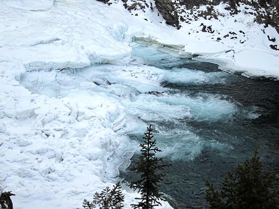 We mooched around in the morning and then Ruth and I went for a walk down to the Bow River Falls. The river was still frozen but the stretches of flowing water were more extensive than they had been a week ago. I guess this is because the temperatures had been reaching highs of around -10oC rather than hovering between -25 and -30 oC.