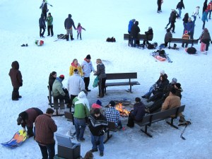 After wandering along the river to the Falls we came to the confluence with the River Spray and the ice hockey rink I mentioned a while ago. This being a bank holiday the place was humming. Must have been over a hundred people in all, skating, playing ice-hockey, tobogganing, standing or sitting around a fire chatting. I guess it’s quality of the background created by the snow which makes it look so very much like a Lowry painting. In fact I seem to remember he did one painting of Peel Park which was very similar.