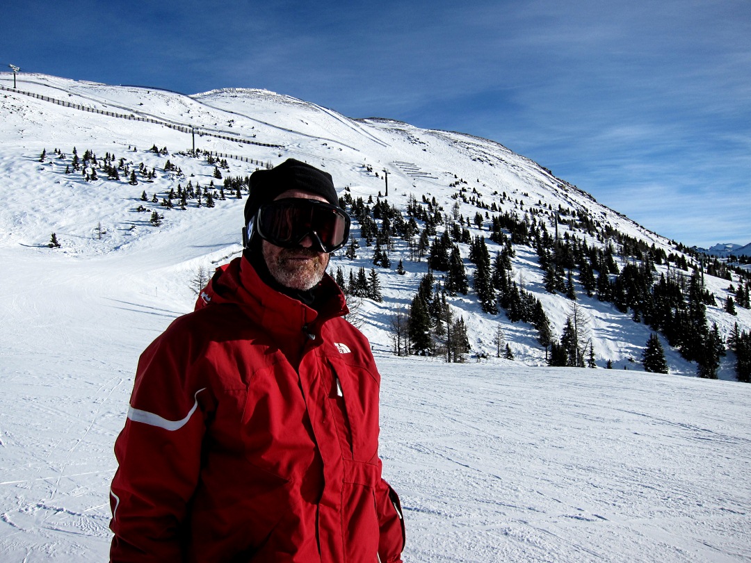 I survive it without any mishap and did more-or-less parallel turns all the way but without any real skill or style and it knocked my flagging confidence even more. We stopped at the bottom of the steep bit of the blue and once again the views were amazing. It was a joy and a privilege to be there. And I could still feel my fingers enough to take photos.