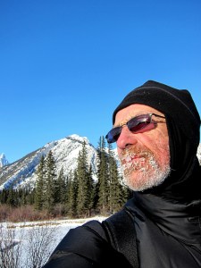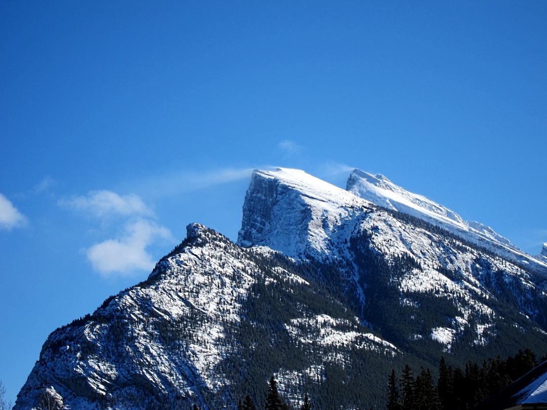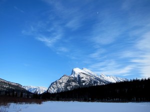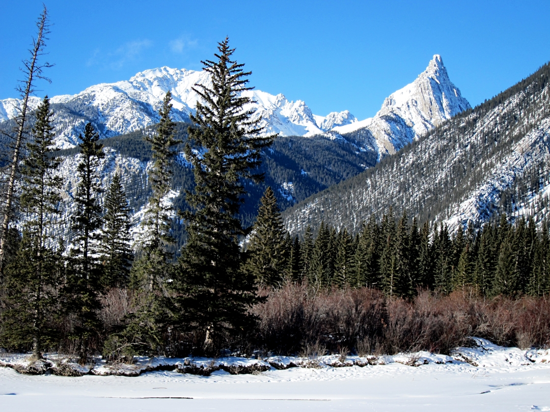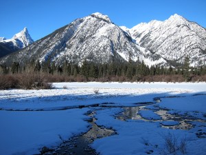 By the time that the jagged outline of Mountain Rundle came back into view most of the river was in the shadow of the mountains which were still gleaming white in the sun. And I was walking more briskly and stopping less often to try to keep warm.