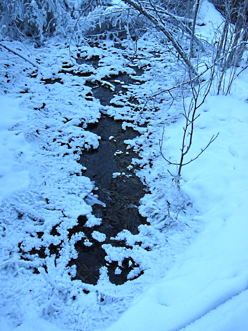 For a while the trail affords sweeping views across the broad expanse of frozen, snow-covered river to the mountain ranges beyond. Even early in the afternoon the shadows are long as the sun as low in the sky. In places there is a narrow channel of flowing water presumably kept open by warmer water from the hot springs.