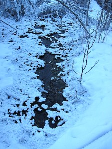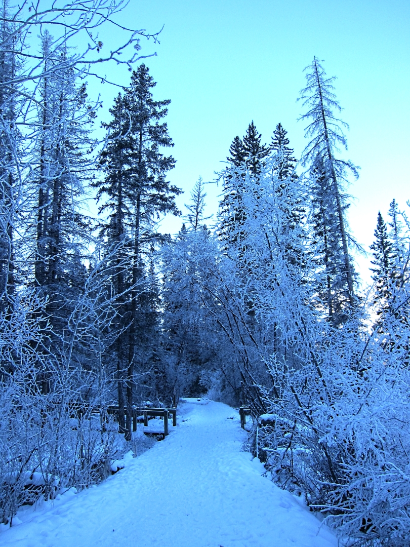 The Cave and Basin site, credited with being the birthplace of the Banff National Park, is currently being ‘revitalised’ and mostly closed so I continued along the Sundance Trail along the river. Just down from hot spring the trail crosses a small stream still flowing through the snow and ice even in this intense cold. I guess it remains unfrozen because the water is being constantly warmed by the spring. The trees, shrubs and other vegetation close to the stream are blanketed in thick hoarfrost because of the higher humidity creating a strangely unreal effect almost like a fairyland grotto in deep shade but with what little light there is reflecting off every surface.
