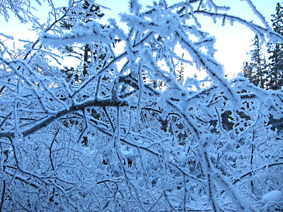 Eventually the trail emerges from the shade of the forest into patchy sunshine but the hoarfrost had now formed on my beard.