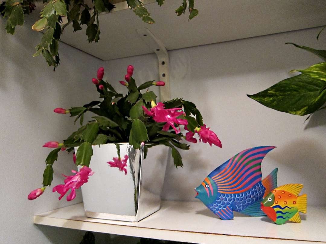 But it has not been all grey. There have been odd bright spots like the corner of the shelf in the loo where one of Ruth’s Christmas cacti has come belatedly into flower to the amazement of the two fish bought on a whim in the airport on Alderney. You can’t make this stuff up. The photos prove it.