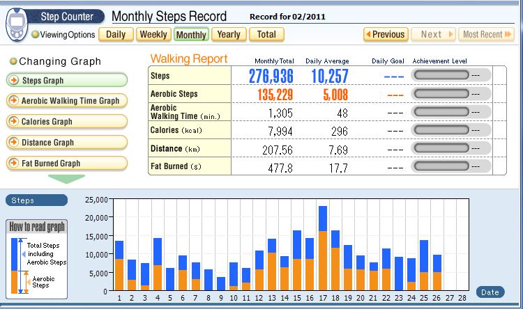 This is where I have to admit to having become obsessive about it. The key is the pedometer which Ruth and Tim gave me for Christmas. Unlike the old one I had it is pretty accurate and comes with the software and the facility to download the data to a PC which then displays the information in graph form. It has become compulsive.