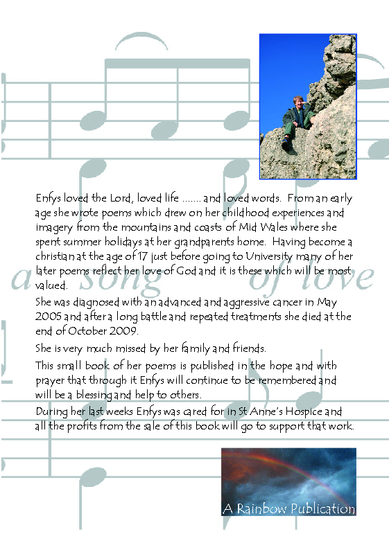 “I and the family publish these poems in the hope and with prayer that through them Enfys will continue to be a blessing and help to others”.