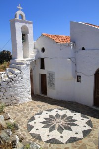 Once outside again it’s up through the arches to the top of the village and the few remains of an old castle and a photogenic church, one of the places where I always get an attack of Repetitive Photo Syndrome. Normally there is a shadow across the black, white and, on Nisyros, red pebble ‘hochlachos’ pattern on the floor of courtyard but today, with the sun at just about its highest, the whole of it was lit up.