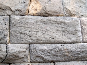 Part of early public notice carved into the massive stones reading “plebs keep at least a metre and a half away from the wall”