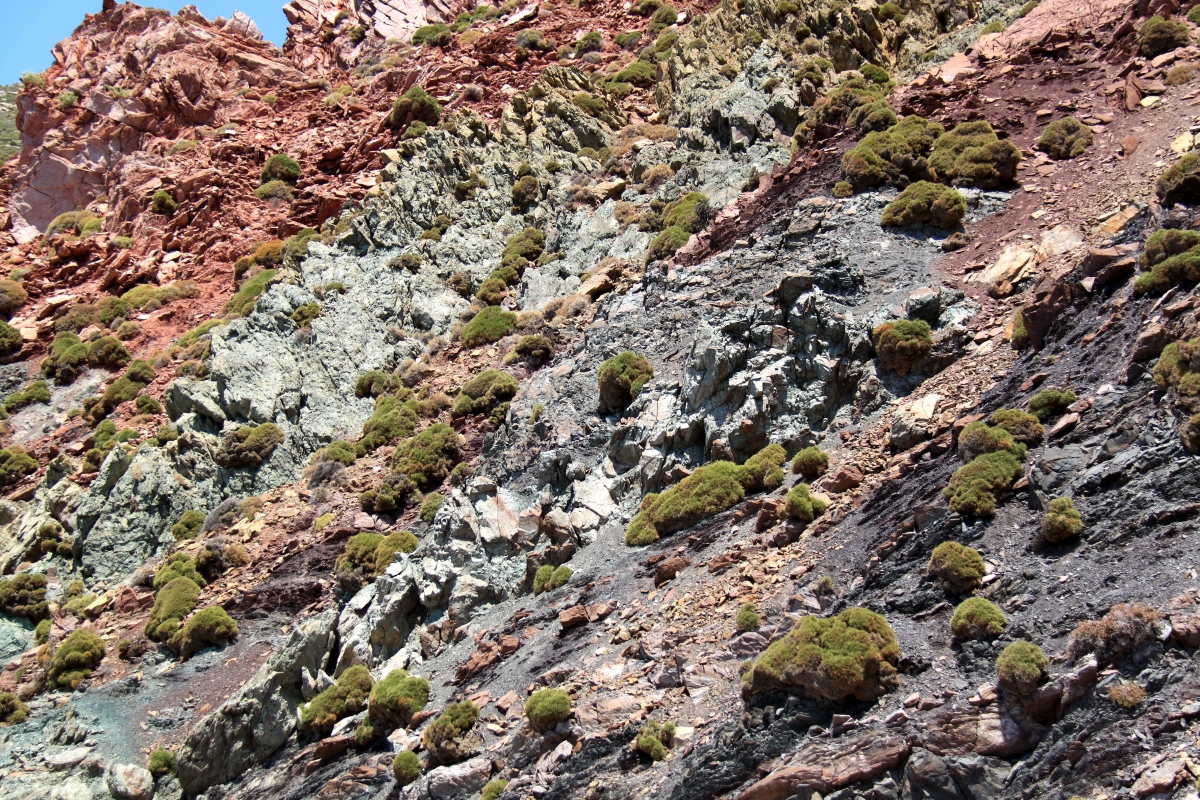 The other main difference is the rocks. The most common rocks on Tilos seem to be sedimentary, limestone in particular, but in places, including where I was walking there are major outcrops of vividly coloured other rocks. Some are very shaley and loose, others are iron-hard extrusions and nodules. The result is a profusion of reds, greens, purples and blacks as well as the whites and greys of the limestone. I know from other visits to Tilos that there are also deposits of pumice, laid down by ash clouds from volcanic eruptions on other islands.