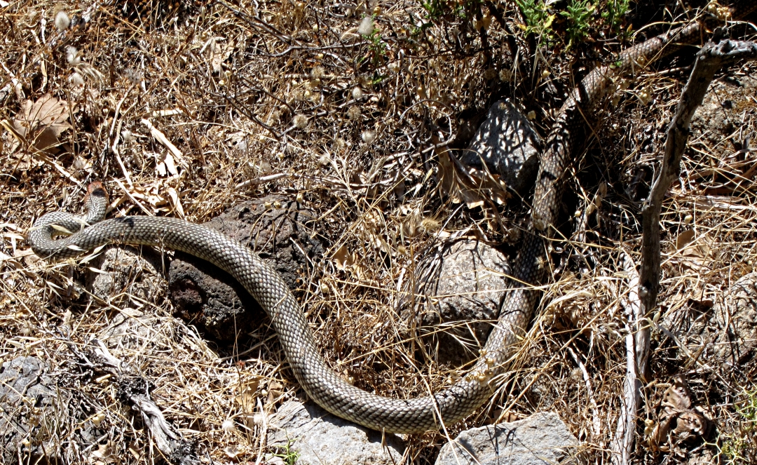 You know when you subconsciously monitor something which jerks you in milliseconds into 100% focus mode? Well, that happened. I suddenly saw the rear 30cms of a large snake slither across the path and disappear down the wall of the terrace to my right. I could literally have caught hold of it and given it a yank. Fortunately, in focused-mode I’m rather quicker thinking than that so I went to the edge to see where it was going, got my camera switched on and ready for action at the same time, thankfully without falling over the 6 foot drop … and there it was on the terrace below about 5 feet long and looking peeved. We first saw a large snake in Greece a number of years ago on Symi and I have been trying to photograph one ever since. Triumph!! It’s difficult composing a shot accurately using the screen on a compact camera in bright sunlight but this one didn’t come out half badly. I’m afraid I haven’t identified it yet, internet connection being a problem, but my guess is on a rat snake. I was pleased to photograph the snake-in-the-wall but a snake-in-the-grass was far better. I was buzzin to use David’s jargon.