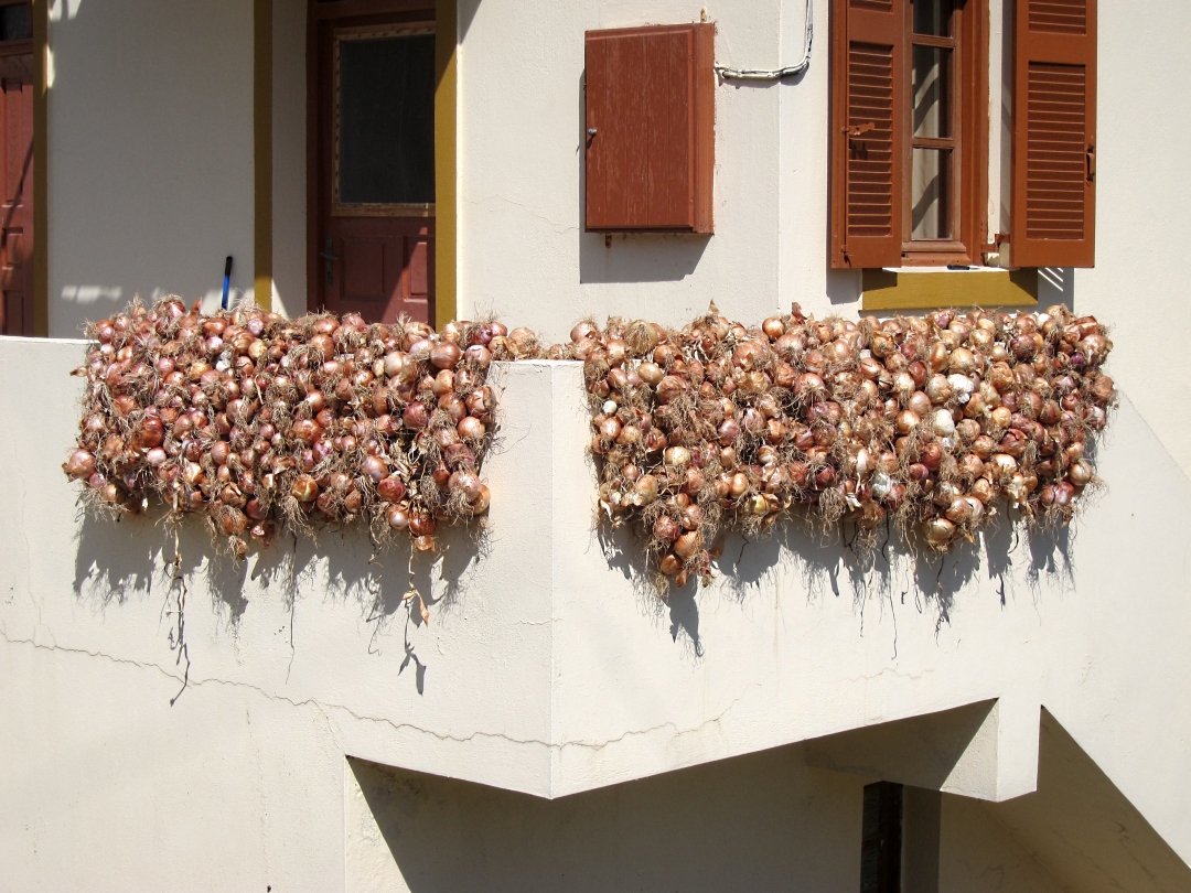 I digress. The slow start to the morning was reflected in the slower than usual walking pace. I had changed my mind and decided that late-night politico-economics was not conducive to the body-stressing walk I had originally planned. So I decided instead to walk up to the ancient Minoan settlement of Nifios and spend a couple of hours poking around there rather than whizzing through en route elsewhere. A slightly delayed start because I met the Dutch lady on her way back from the shops stocking up for the walk she and her husband had planned to the caldera and the crater. I also stopped about 100 metres from the hotel to photograph some onions.