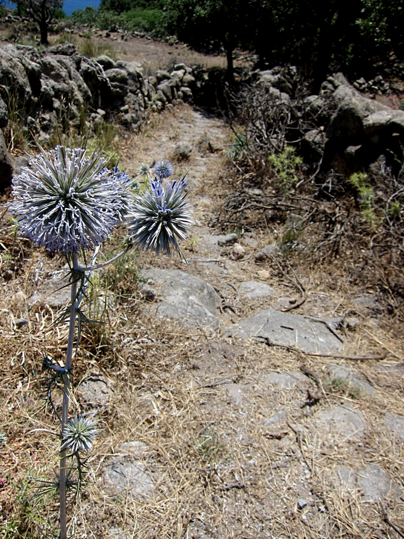 The path from Nikia down to the coast I had done on only one occasion with Enfys and I struggled to remember where it started. It obviously isn’t much used now because it was getting seriously overgrown not only with grasses and cereals but a number of types of very prickly plants. But it presented no real problems and was quite a dramatic walk. Much of it is paved kalderimi, in places very wide, anything up to 3 metres, in other places narrow between walls and barely half a metre. The tall, ultra-prickly thistles I had noted in flower on Tilos but not Nisyros were prolific along this path, presumably because it faces south and so is warmer.