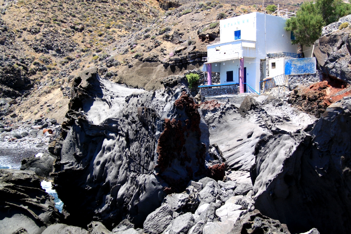 Avlaki is an amazing place, very different from anything I have seen on any of the islands. Basically it’s a scene of industrial dereliction, another time-warp. It would not have looked out of place in the South Wales Valleys 40 or 50 years ago, apart from the cloudless sky, hot sunshine and the bright blue Aegean that is. The tiny harbour was used until the 1950’s to bring in supplies for Nikia, goods being loaded from larger ships into rowing boats to bring them through the narrow gap in the rocks which give partial protection from the rough seas. The rocks in the sea, on the foreshore, in the cliffs are amazingly variable somejet black others bright coloured reds, purples and ochre.
