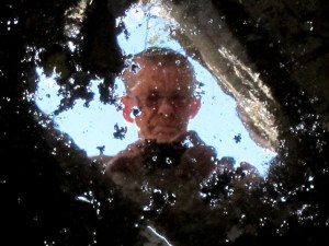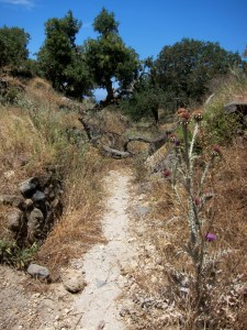 As last year the first part of the kalderimi was good, a little overgrown but that presented no problems. This time I turned left at the road instead of going straight across and eventually found a path. Of sorts!! It certainly wasn’t a kalderimi. In fact basically it was following a stream bed floored with pumice gravel varying in width between half a metre and the width of a sandal, periodically so choked with spiky trees that the ‘path’ climbed out of it before rejoining it a little further down.