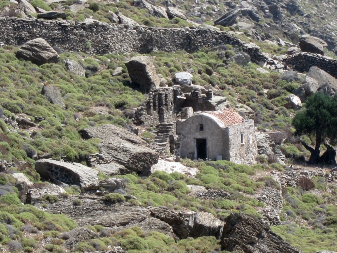 I passed the point where I had turned back yesterday and then diverted off the main path to a  small chapel recommended as worth a visit.  One thing about this and apparently some of the other paths on Amorgos, they are well signed.  In the UK there are finger-post on main roads indicating where a path begins and then you’re on your own.  This path not only has numbers at regular intervals to confirm that your still going the right way but at junctions has finger posts to indicate which destination each path leads to.  I turned off Path Number 1 onto a narrow, winding path to the chapel of Ioannis Chrysostomos set in walled enclosures with ancient olive trees and huddled into the craggy rocks.  The sad thing is that there is no door and animals obviously wander in and out, the evidence for which was all over the floor.  Which is a shame because the frescoes inside are obviously very old but are deteriorating.  A remarkable thing however is that this must have been one of the first places in Europe, if not the world, to have indoor plumbing.  The well is actually inside the chapel with a feta-can tied to a rope for hauling water up.  I guess the feta-can is a bit newer in origin.