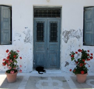 After the swim I ambled around the headland and then back to the village taking what I suppose could be described as cliché photos. There is just something about the whiteness of the buildings and blueness of the sea, the sky, the doors and windows, and the church domes, together with the splash of colour of the boats which makes some places very visually appealing.