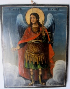 The map showed the path reaching a ridge-top track by a small church so I stopped there for a drink and look around. It was nothing ornate, no frescoes, just very simple with a couple of framed paintings.