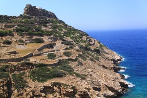 I got off at the appropriate road junction and walked into the village to look for the path to take me to the ancient castle, the Kastri as it is called.  For once the SKAI map was quite accurate and helpful, too many times I have found it not to be, and I was soon on a very good path dropping down towards a blue-domed church.  Blue domed churches seem a lot more common on Amorgos than the other islands I have been to, perhaps they are a feature of the Cyclades.  They are certainly attractive and this one particularly so outlined against the blue of the sea and the sky.