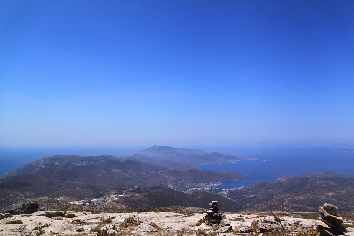 The view from the top of the mountain: Chora below on the left, the main harbour further below in the centre