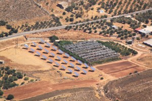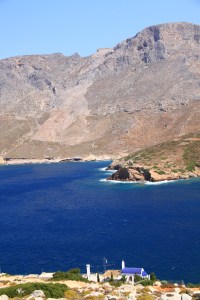 I got to the top of the col in good time but in need of some shade for a short break to eat my banana and peanut brittle (no nut bars on sale in the Mini Market in Emborios). Unfortunately the newly built chapel at the top is surrounded by walls topped by steel fencing which would not have looked out of place on a moderately high-security prison, so no possibility of getting any shade.
