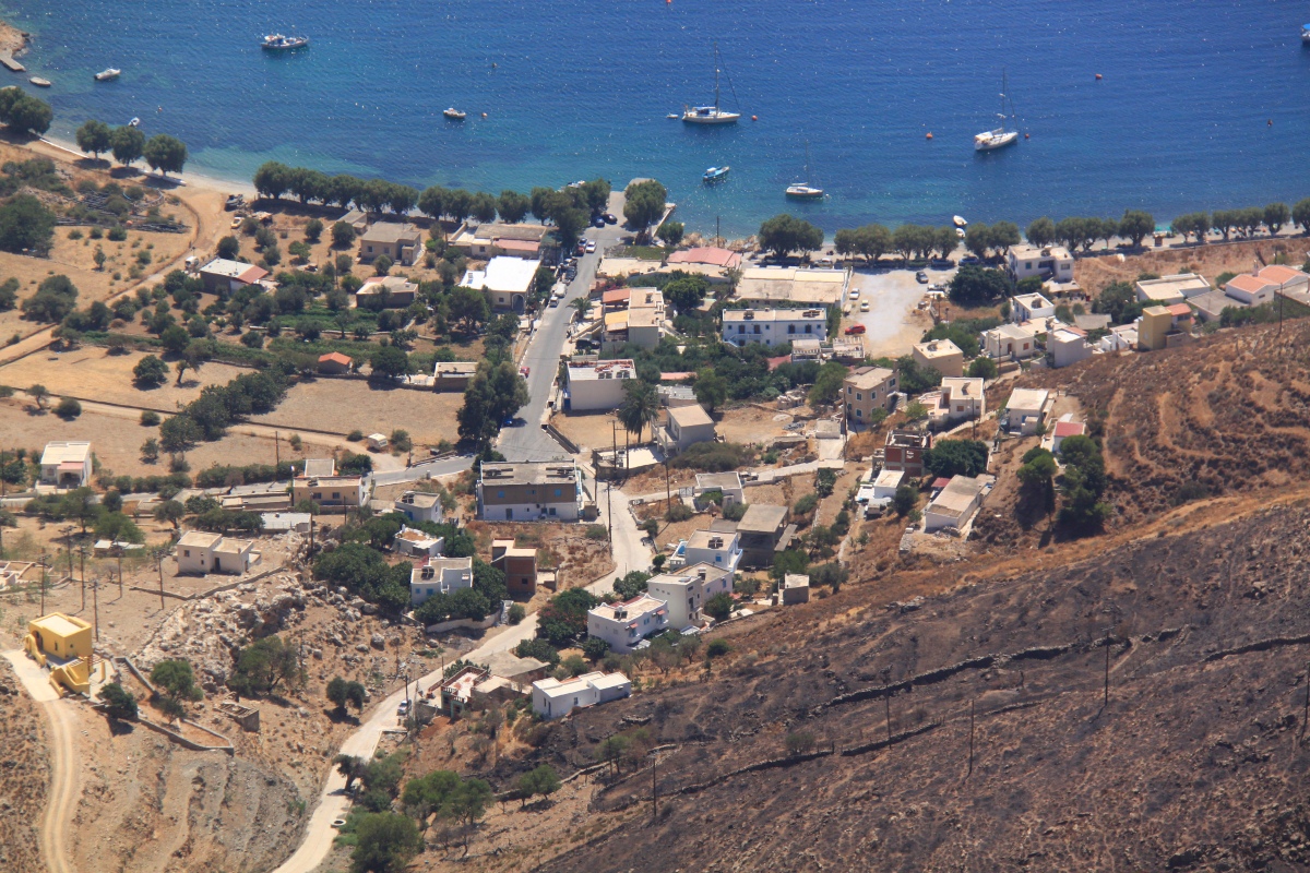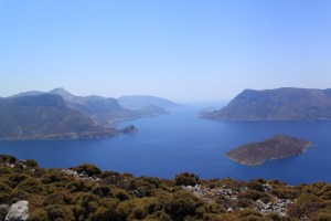 I soon found the path which was surprisingly well trodden considering that it didn’t go anywhere. I followed it diverting to take in the tops of 3 of the peaks along its length and finally reaching the top of the crag looking straight down along the main street in Emborios. I think the path is there because in times-past it linked ancient settlements along the ridge top, now the spectacular views of both East and West sides of the island make it worthwhile with the added benefit of approaching the northern tip of Kalymnos and so looking towards the island of Leros a short distance to the North as well.