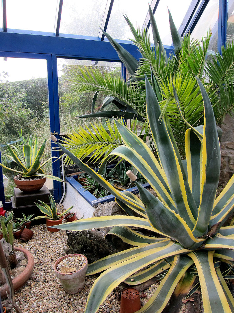 However, the agaves in the Blue House proved the most resilient and, if anything, actually continued growing.  The two which are in the ground in the Blue House are now getting so big that they are making it difficult to move around, spreading to about 8 feet across, the same size as the palm tree which is between them. I’ve had to put corks on the tips to avoid being savaged as I edge past them.  Some year soon now they will flower and that will be a BIG problem as flower spikes can be 20 feet high and the Blue House is only 15 feet high in the centre.