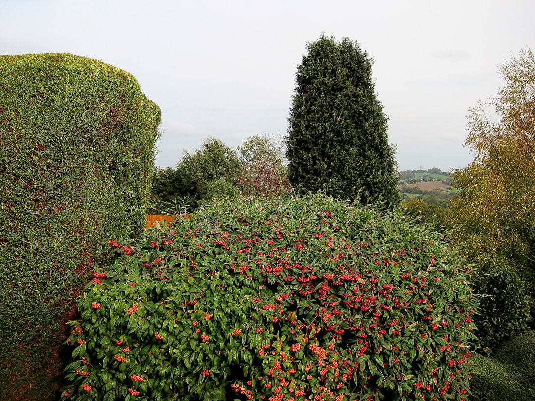 Old Wives’ Wisdom would have it that an abundance of berries on trees and bushes is a sign of a hard winter to come.  My view is that it is an indication of the conditions we have had in the seasons just past.  Whatever, the birds are well provided for this winter, however it turns out, because there is a super-abundance of berries, particularly on the tree-cotoneasters.  Usually the berries sit there until a flock of birds from the blackbird/thrush family descends on them and then they are stripped in a few days.  They seem to eat chromatically, starting with the bright red berries, then orange, then yellow.