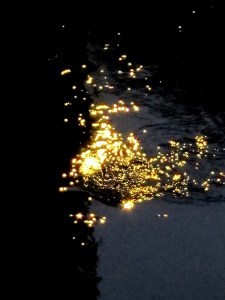 No, not the reflection of the sun but a street light on the M60 glinting in gold shards on a small rapid on the river