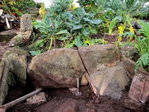 For a start they had become deeply embedded in the clay layer underlying the subsoil so a trench had to be dug just to get at the base of the slabs. Then there was the fact that they are both significantly heavier than most of the many other heavy stones in the garden. I can’t remember whether I could pick them up and carry them when I fetched them from the old mountain quarry 30 years ago but somehow I suspect not. However, somehow I got them into the trailer at the quarry, from the front gate about 50 metres down the garden, and then stood them on edge. After 30 years in situ difficulty in handling the weight was compounded by the fact that they were muddy and wet therefore difficult to get a grip on.