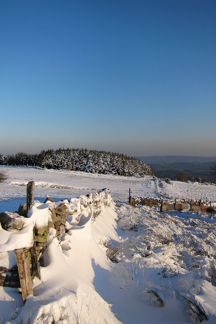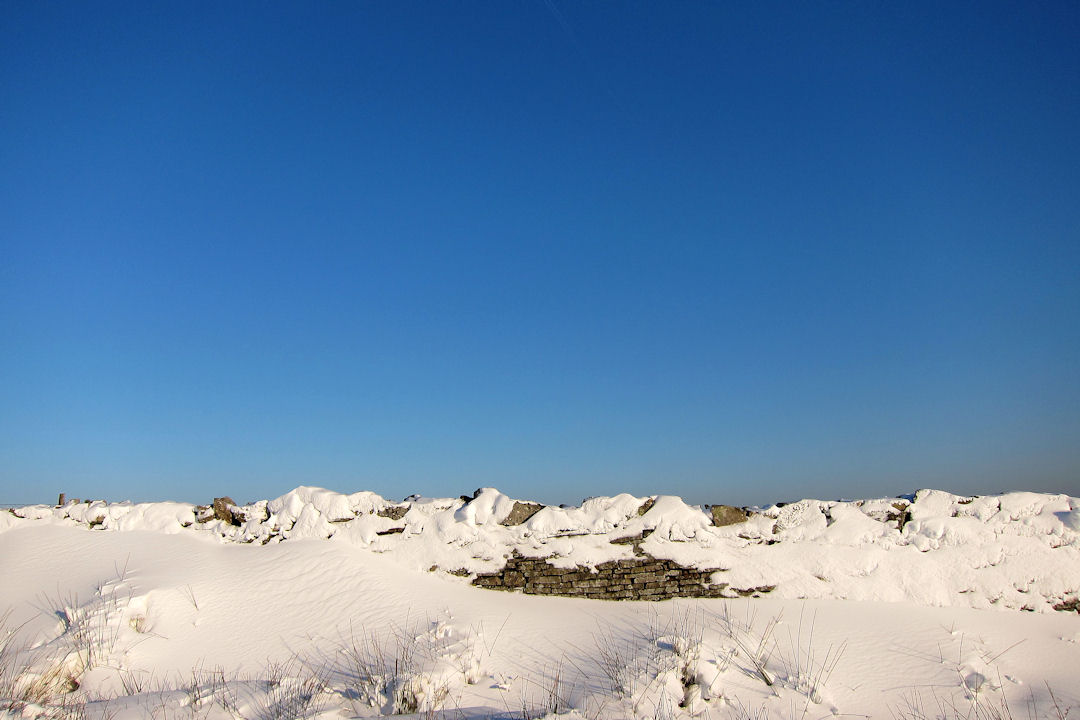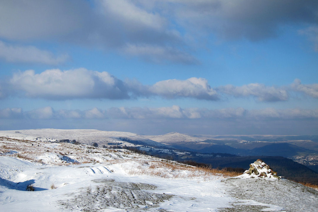 With the decorating behind me, a more significant dump of snow and cloudless skies it was time to go out and play up the mountain. So on Wednesday I went up Mynydd Garn Wen, the 425 metre (1,400 feet)mountain towards the southern tip of the Brecon Beacons National Park and on Thursday I walked the length of the ridge to the 555 metre (1,800 feet)high Blorenge mountain and dropped down the steep North face into Abergavenny. On the entire ridge-top the ground was frozen hard and there was a fair amount of snow even in the sunshine. The strong wind blew the snow into drifts in places over a metre high, stripping it off exposed parts covered in a thin sheet of smooth ice. This was a taste of real winter. Two good walks. Fabulous!!