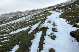 The snow persisted where it had been deepest: the remnant cornice around the rim of the cliffed edge; in the sunken parts of tracks and paths; in folds in the ground; and in ditches, gullies and stream beds. The sun is at its warmest when it strikes the ground at right angles, that’s why it feels warmer when you’re standing up than lying down at this time of year. Where the ground slopes away from the sun it thaws more slowly than when it’s angled towards it. Subtle things but they make a big difference. On the macro scale there is more snow left on the North scarp than on the Southern slopes of the mountain. On the micro scale here is more snow left in features angled northwards.