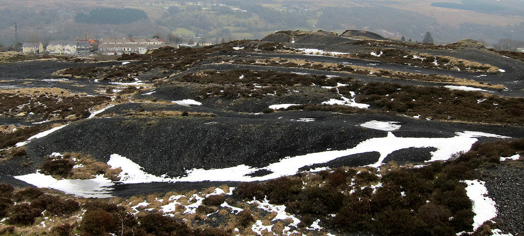 Close to civilisation at the end of the walk, remnants of snow stand out starkly against the black of colliery spoil dumped half a century ago and too acid to revegetate.