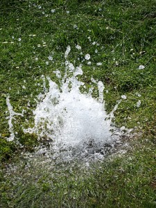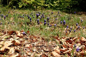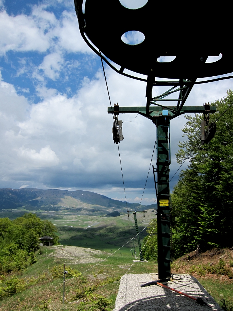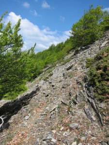 Coming out of the forest onto high level pastureland and the path disappears. Sometimes the line of it can be made out because there is a line of slightly shorter grass with fewer flowers where the soil has been consistently compacted by the passage of feet. You can follow this if you are on the line but not infrequently there is no indication at all and you just have to make a guess as to where path goes or scout around at the next edge of forest to find it again. Over rocky ground the path frequently disappears completely.