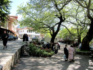 First port of call was the fruit shop to stock up on bananas. As I ambled down the steep main street I was struck by the number of people walking up in their ‘Sunday Best’, obviously on their way back from morning service at the church in the town centre. As I got closer to the main square it was clear that it was humming with life. It seemed that about half the entire population had been in church. Some were just standing around chatting to friends. Others were ensconced in coffee shops. A number of more elderly ladies were in traditional dress with very colourful additions to the basic black. It was obvious that here in Metsovo more people were devout Sunday worshippers than anywhere else I have been in Greece.