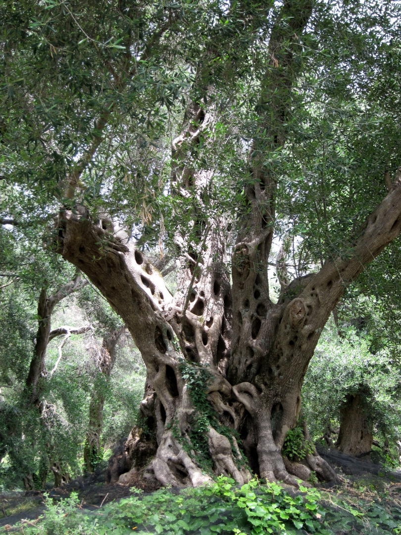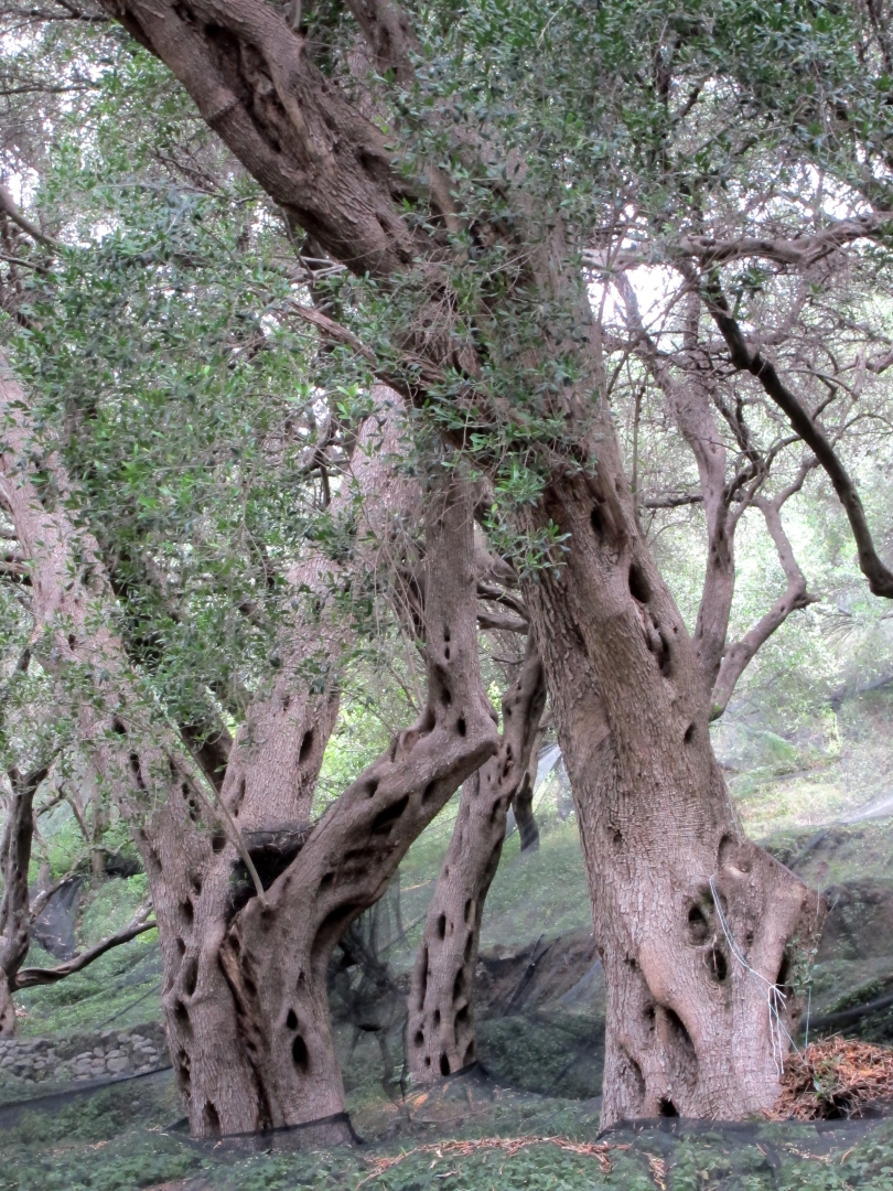 Other worldly look: massive olive trees with acres of black netting spread out below to catch the fruit as it falls