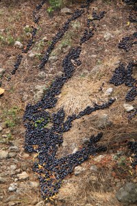 Olives drop from the trees and flow in rivulets down the plastic netting to collect at low points from where they are gathered