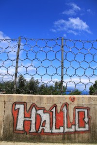 Art variation of chain link fence. Each lop is about 40 cms in diameter and individually made from 5 mm steel hawser, must have cost a bit. Graffiti a common miss-spelling of a friendly greeting