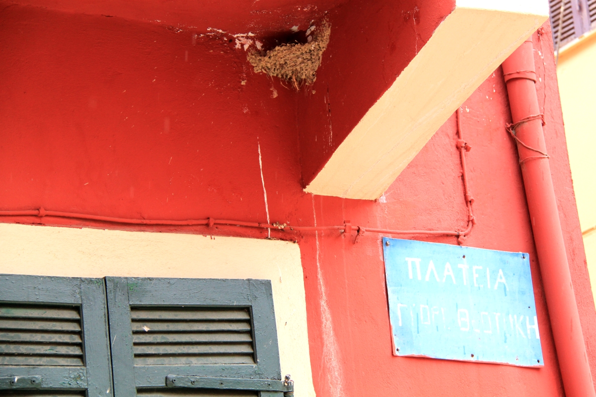 I dropped back down into the village which turned was the best place to be because for 15 minutes it then rained.  The streets in the village are very narrow and winding, typical of many parts of Greece but now confined to tourist honey-pots in the UK like Mousehole in Cornwall.  Standing in one of the little ‘squares’ (‘plateia’ in Greek so not implying a geometric shape) only about 20 feet at its widest and sheltering underneath a canopy I was amazed at the number of swallows swooping around.  I’m used to seeing them round here along the road and on open hillside but this was in a narrow street.  I soon spotted why.  There were nests under the balconies on some of the buildings.  Fascinating.  If it hadn’t rained any I hadn’t sheltered I wouldn’t have seen them. Serendipity certainly but as I see it as Providence as well.