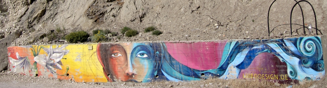 Very many very good examples of street art on retaining walls in this area. This was one small example of dozens