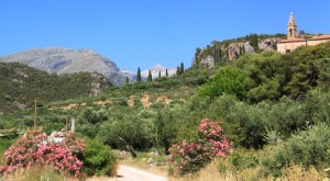 The track leading into the Viros Gorge with the church of Agios Spyridon up on the right. Profitis Ilias, the highest Mountain in the Taigetos range in the background …. still with snow on it.