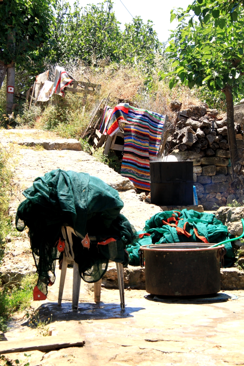 From there I got really boring and dropped down a very good kalderimi (paved donkey path) and encountered wash-day blocking the path. It reminded me, very nostalgically, in some way of my uncle’s farm in Carmarthenshire which had no running water inside the house, no bathroom and only an outside loo at the end of the orchard. There was a large 45 gallon drum with handles boiling water over a wood fire burning slowly underneath it . The water was then transferred it seems to a smaller drum where the nets for catching the olives were being washed ready for the Autumn’s crop. The household rugs had already been washed and were draped alongside the path to dry in the sun. There was a route through washday-on-the-path. Fascinating!