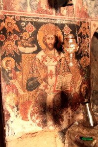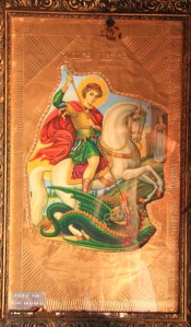 Another Greece-in-Europe connexion on the walk. I was heading for a village called Proastia shown on the map to have 3 Byzantine churches. Fascinating place. Just before the village was the small church of Agios Giorgos with door unlocked. Inside were the remains of frescoes and a picture of himself slaying his dragon. Why is St George always associated with England? There are far more churches dedicated to him here in Greece and every single one has multiples of the same picture.