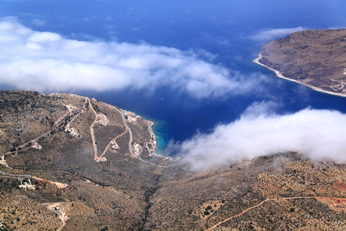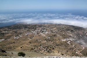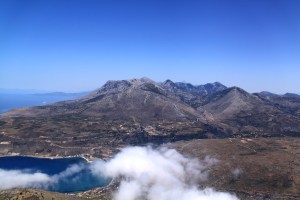The view from the top was very much worth the climb. On the West side a thin band of cloud was spreading up the coast from the south creating a very strange ‘edge of world’ impression. The mountain seemed so massively high with the near-vertical drop to the low level plateau the whole thing looked unreal. In the opposite direction the whole East coast of the Mani peninsula was in sight all the way up to Giethio. To the north, Itilo and the higher peaks of the Taygetos, to the south the end of the peninsula.