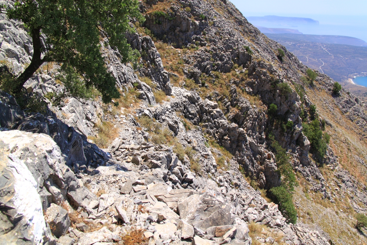 It did have a footpath but not one for the fainthearted. It is a very steep and in many places rocky climb. A road has been bulldozed up the back of the mountain to the chapel on top and I reckon that since then the footpath as been neglected. It shows indications in places that it was once a well laid paved path but is now difficult to follow and a number of sections close to the top have been overrun by loose scree.