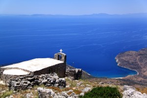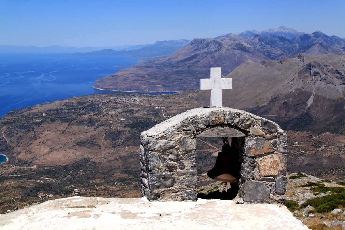 Looking north to at least two other Profitis Ilias mountains, the one above Areopoli just to the right of the cross and the highest in the Taygetos in the far background