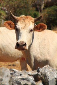 Remember that footpath which traumatised me on Wednesday? This was one almost as bad. It started off OK, a bit overgrown with tall grasses, wild cereals and small prickly stuff, just as the path I had followed in the morning had been. But after about 15 minutes it had become gradually so bad that I resorted to walking, or rather teetering’ along the top of the stone wall much to the surprise and then the terror of cows grazing in the field on the other side of the path. They ran off like the herd of pigs in the Biblical story, though thankfully not off the edge of the cliff. I teetered along the wall for about a mile.